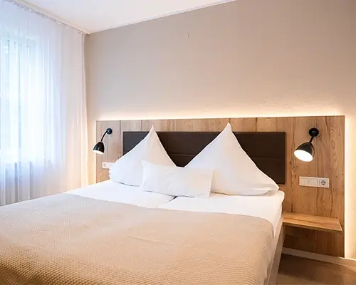 Unsere elf Doppelzimmer sind ideal für Paare oder Alleinreisende, die Wert auf Komfort und Ruhe legen. Helle Farben, natürliche Materialien und ein klarer Stil schaffen ein Gefühl von Leichtigkeit.
